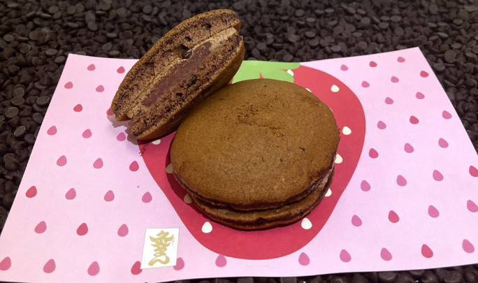 香川県産の小麦粉を使ったどら焼きの生地にチョコレートを練り込み甘酸っぱい苺あん、